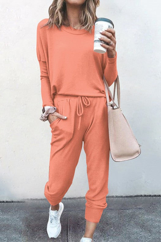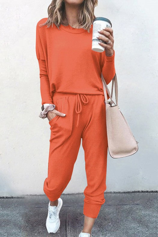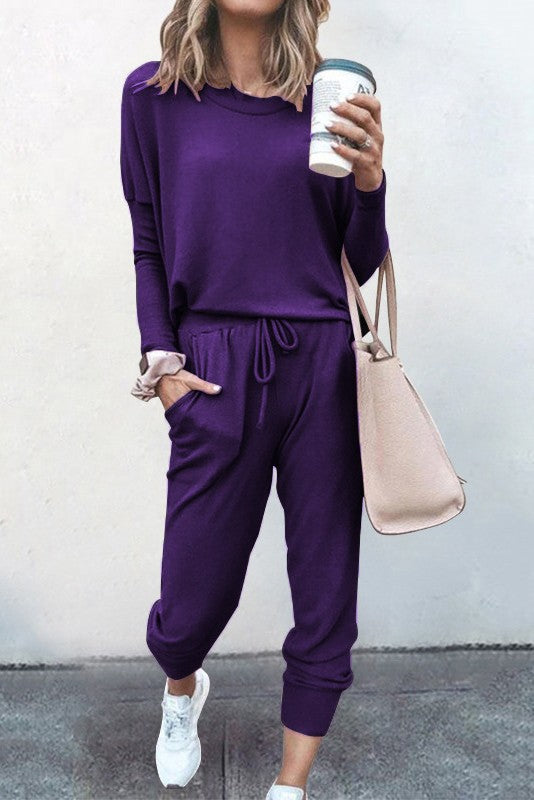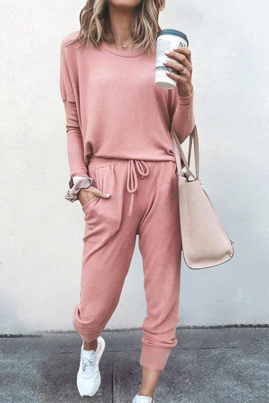 The weekend jogger set is a loose fit that features long sleeves, round neckline and has a drawstring pant with pockets. Its available in 16 fabulous colors and is available in sizes S - XXXL.